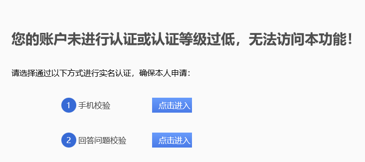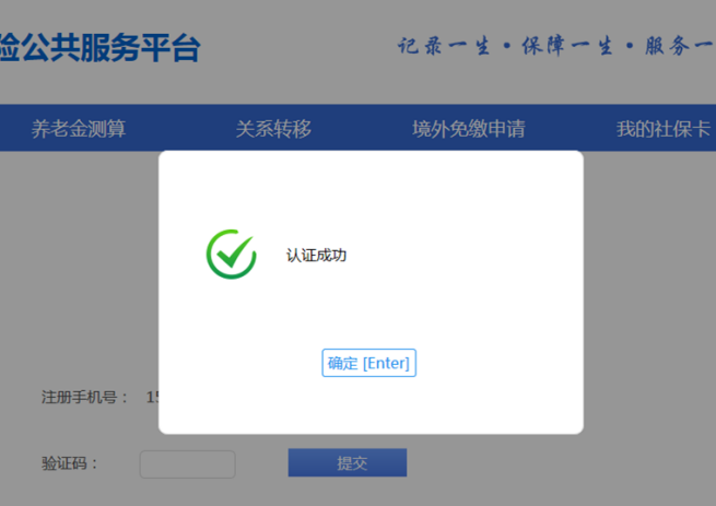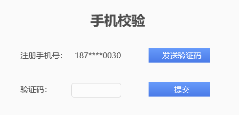 4.登錄成功后,若出現(xiàn)以下界面,請(qǐng)點(diǎn)擊手機(jī)校驗(yàn)右側(cè)的“點(diǎn)擊進(jìn)入”——點(diǎn)擊“發(fā)送驗(yàn)證碼”——輸入驗(yàn)證碼——點(diǎn)擊“提交”——點(diǎn)擊“確定”,提示認(rèn)證成功;