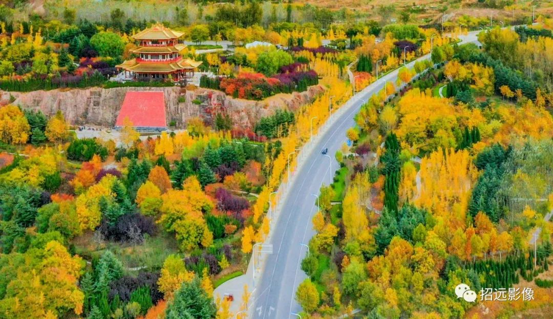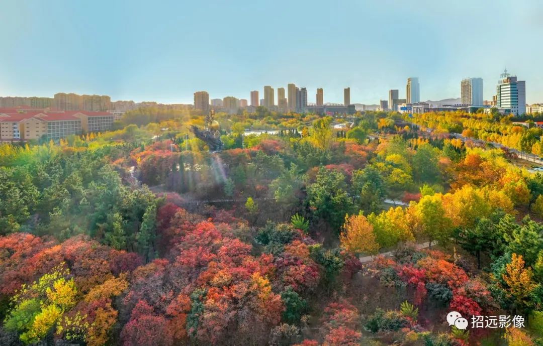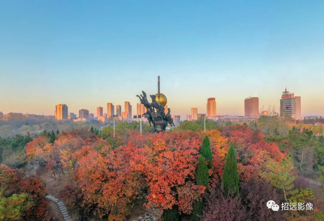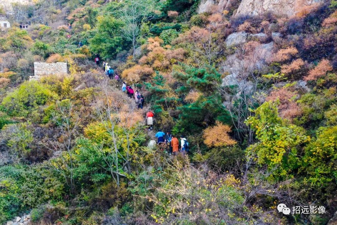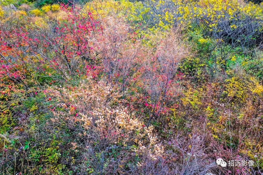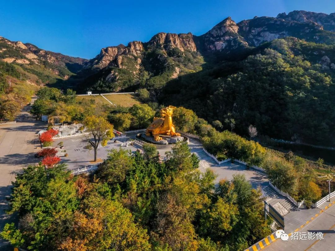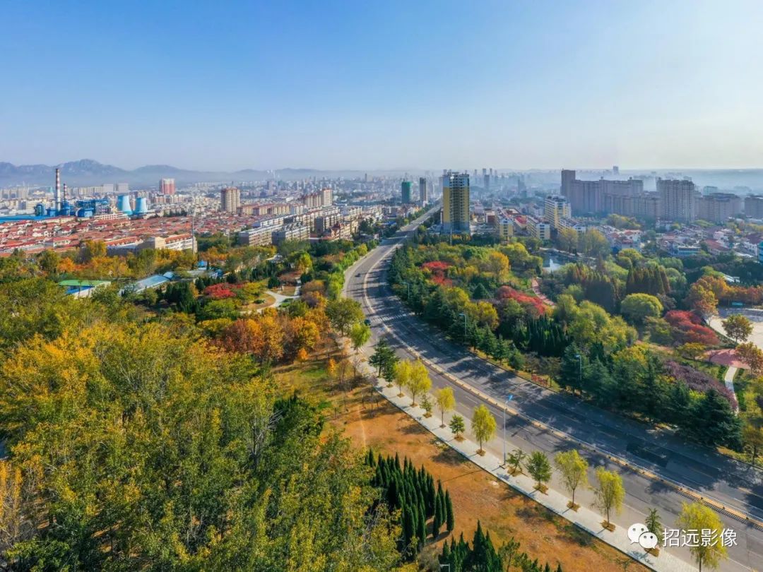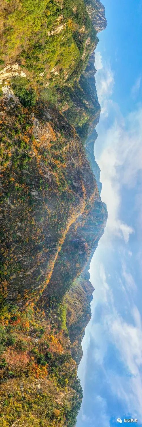 招遠的秋天,藍天白云,層林盡染,