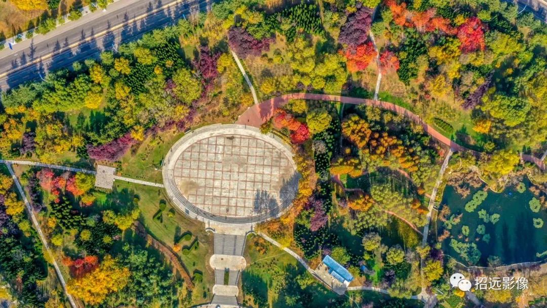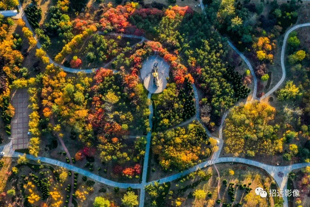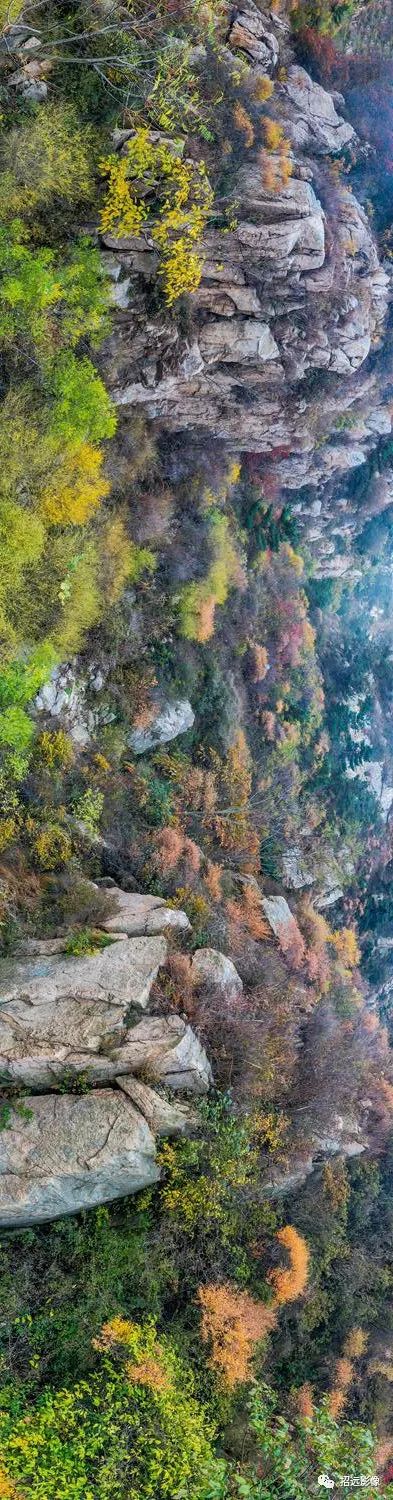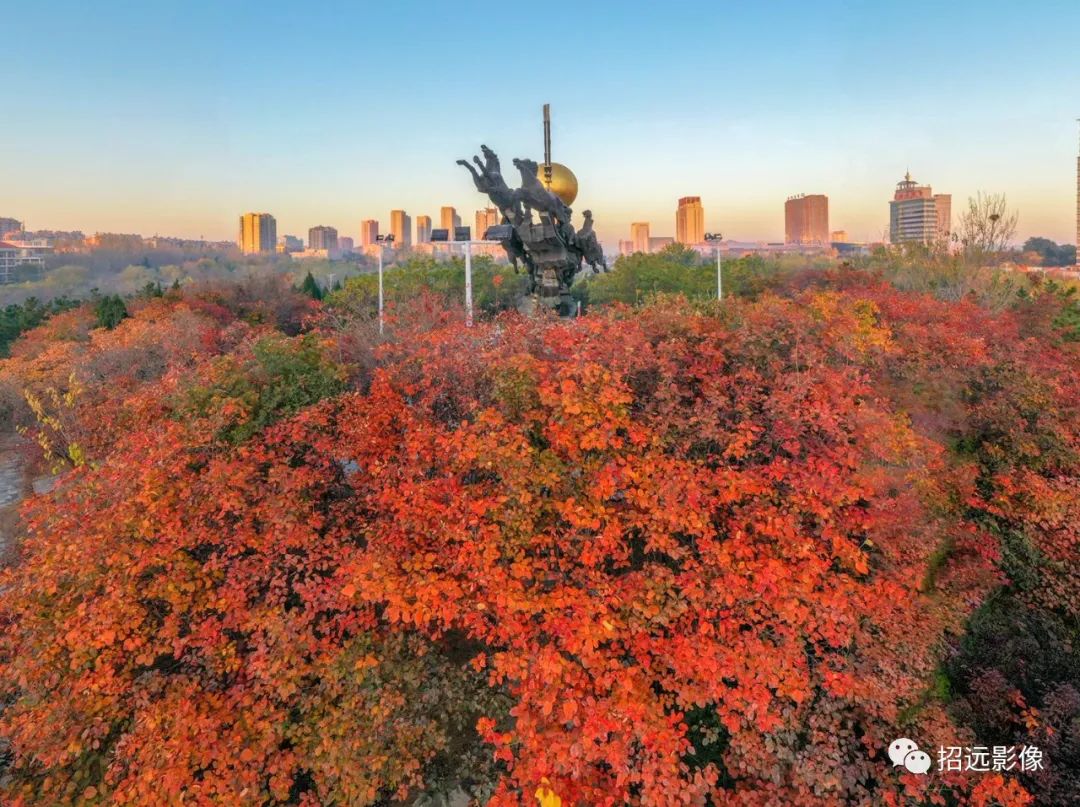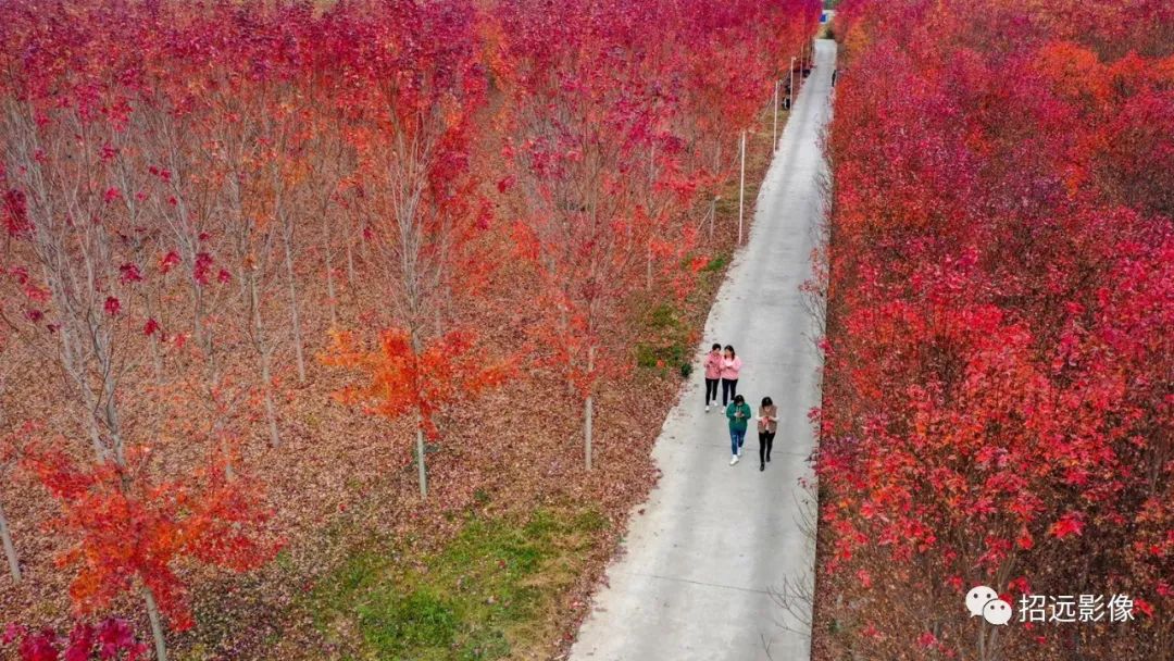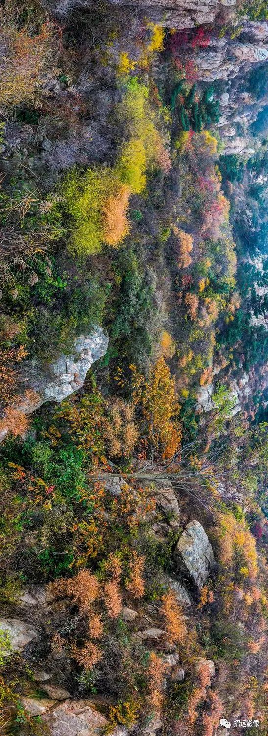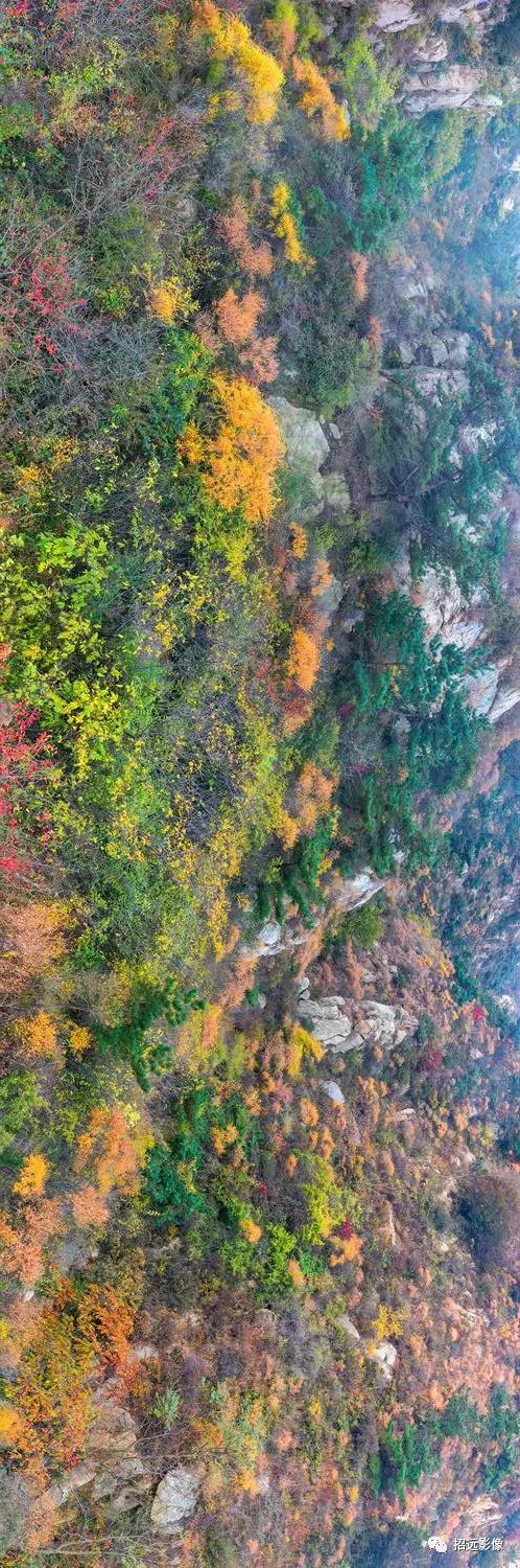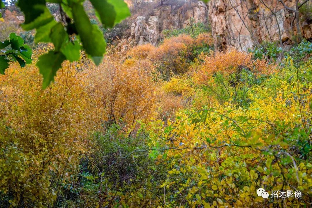 招遠的秋天,藍天白云,層林盡染,
